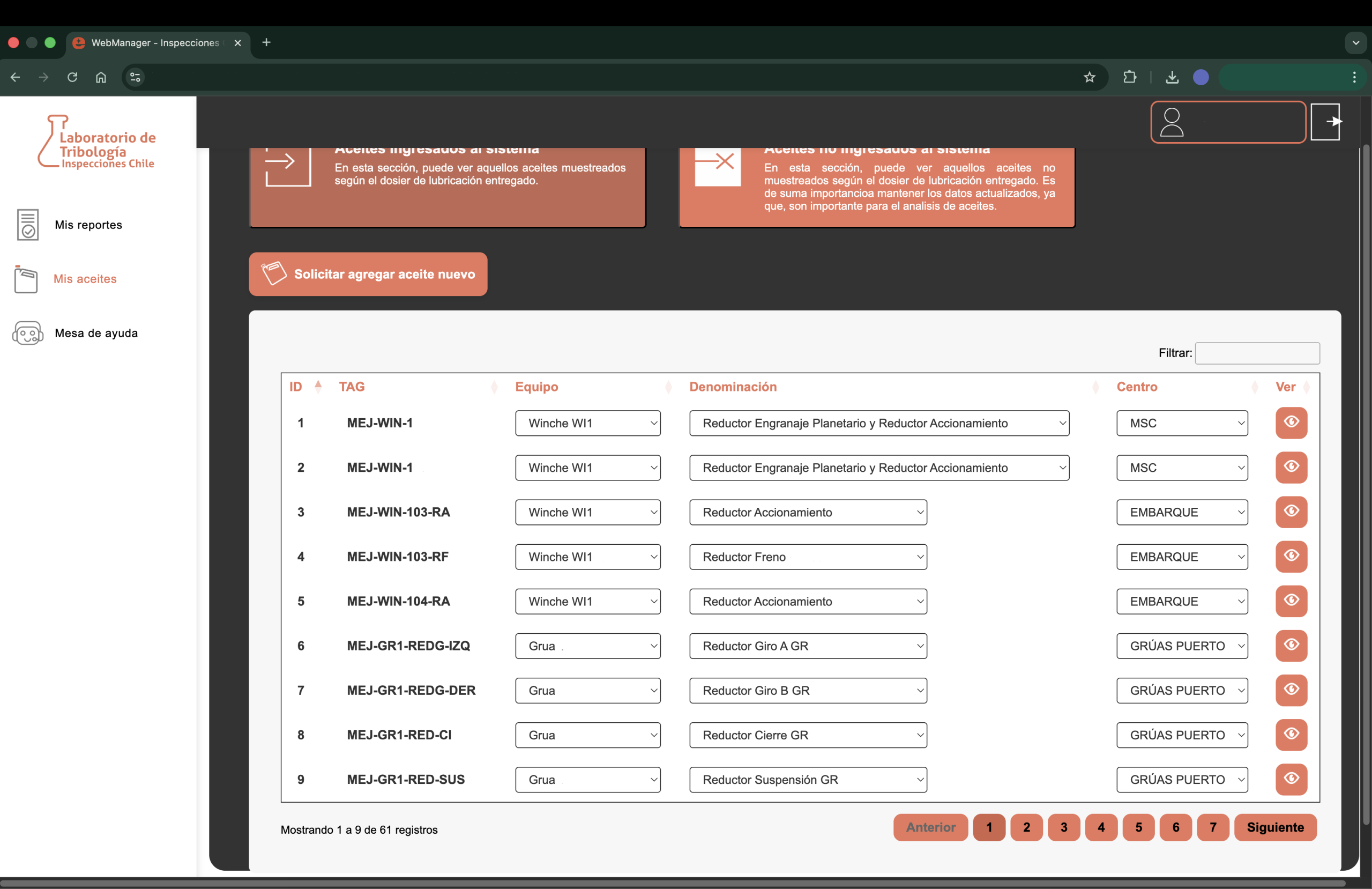 En esta sección puede agregar y ver todos los aceites que tiene en sus equipos asignados a la carta de lubricación entregada.