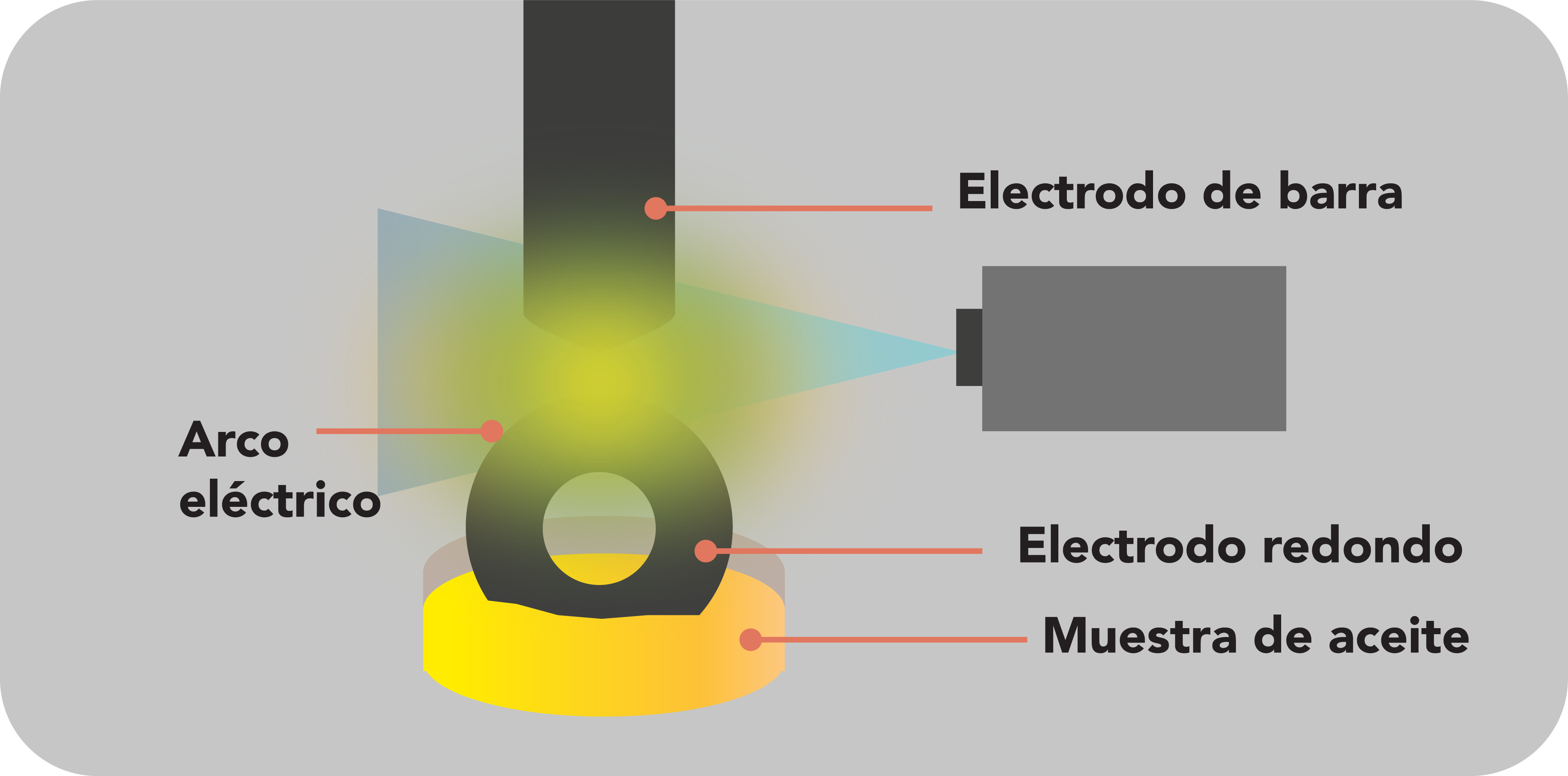 En este instrumento, el aceite se vaporiza y se excita utilizando una descarga de alta tensión entre un electrodo y un disco de carbono giratorio. El RDE detecta y cuantifica elementos de hasta aproximadamente 10 micras de tamaño. El cual puede cuantificar: Contaminantes, Aditivos y Metales.